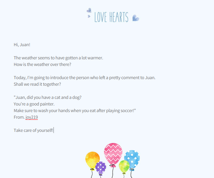안녕~ 후안아! 날씨가 많이 따뜻해진 것 같아. 그쪽 날씨는 어떠니? 오늘은 후안이에게 예쁜 댓글을 남겨주신 분을 소개하려고 해. 같이 읽어볼까?