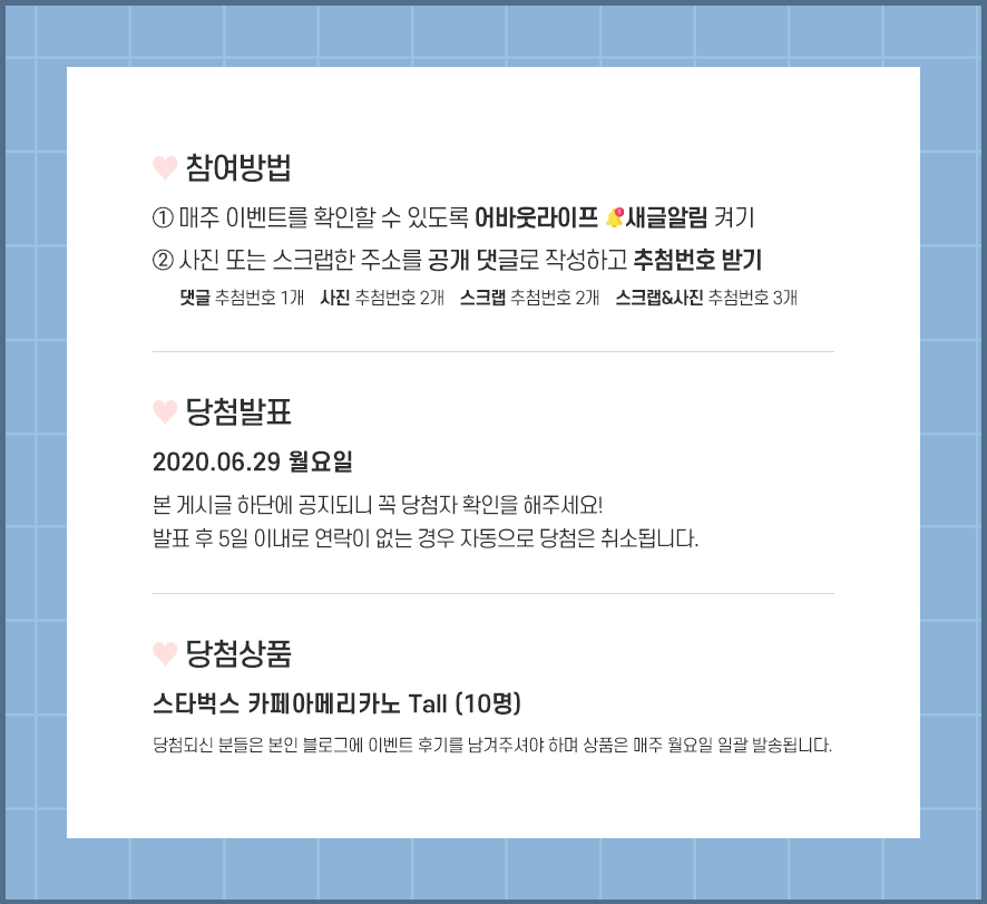 열 분을 추첨하여 스타벅스 카페 아메리카노를 드리도록 하겠습니다 ღ